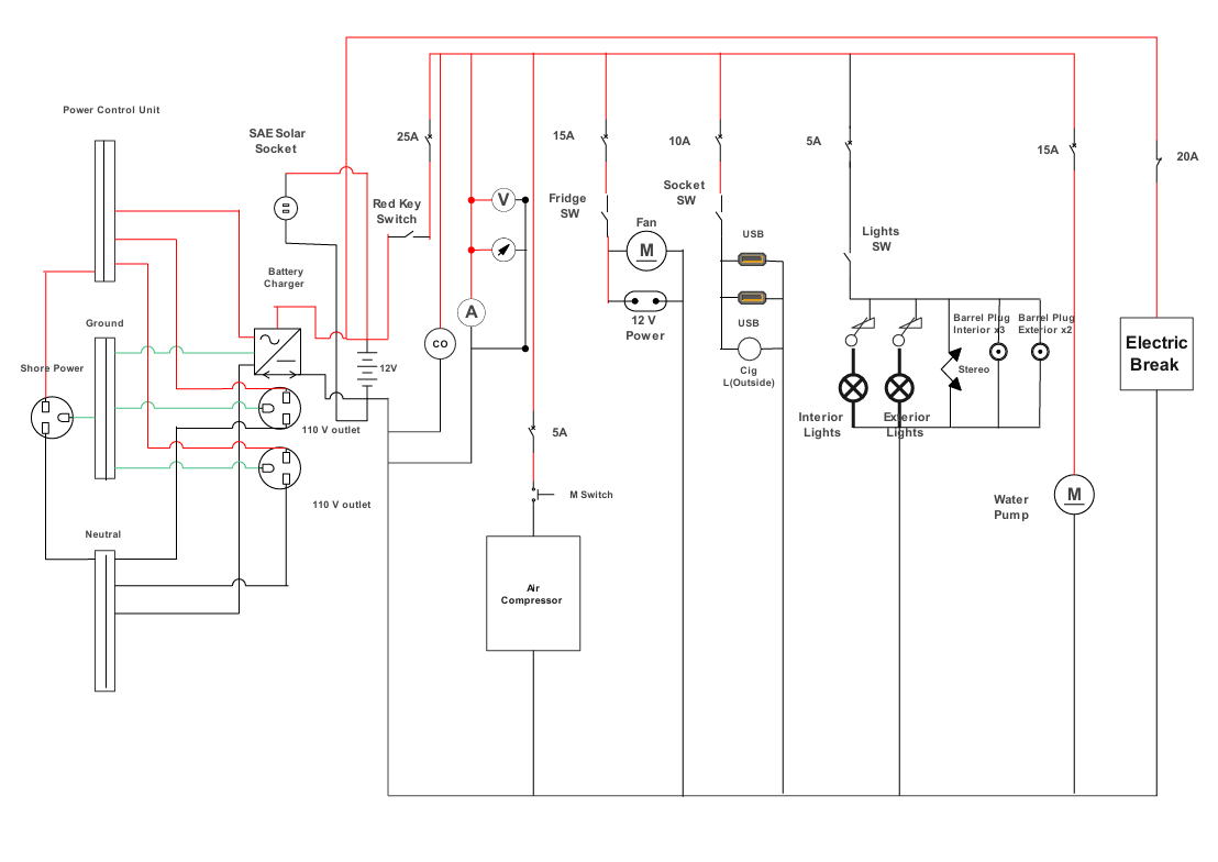 - Interior combined 12V DC and 110V AC wiring (solar controller, inverter, battery charger, compressor, fridge socket, water pumps, LED lighting, heater pads, USB outlets)